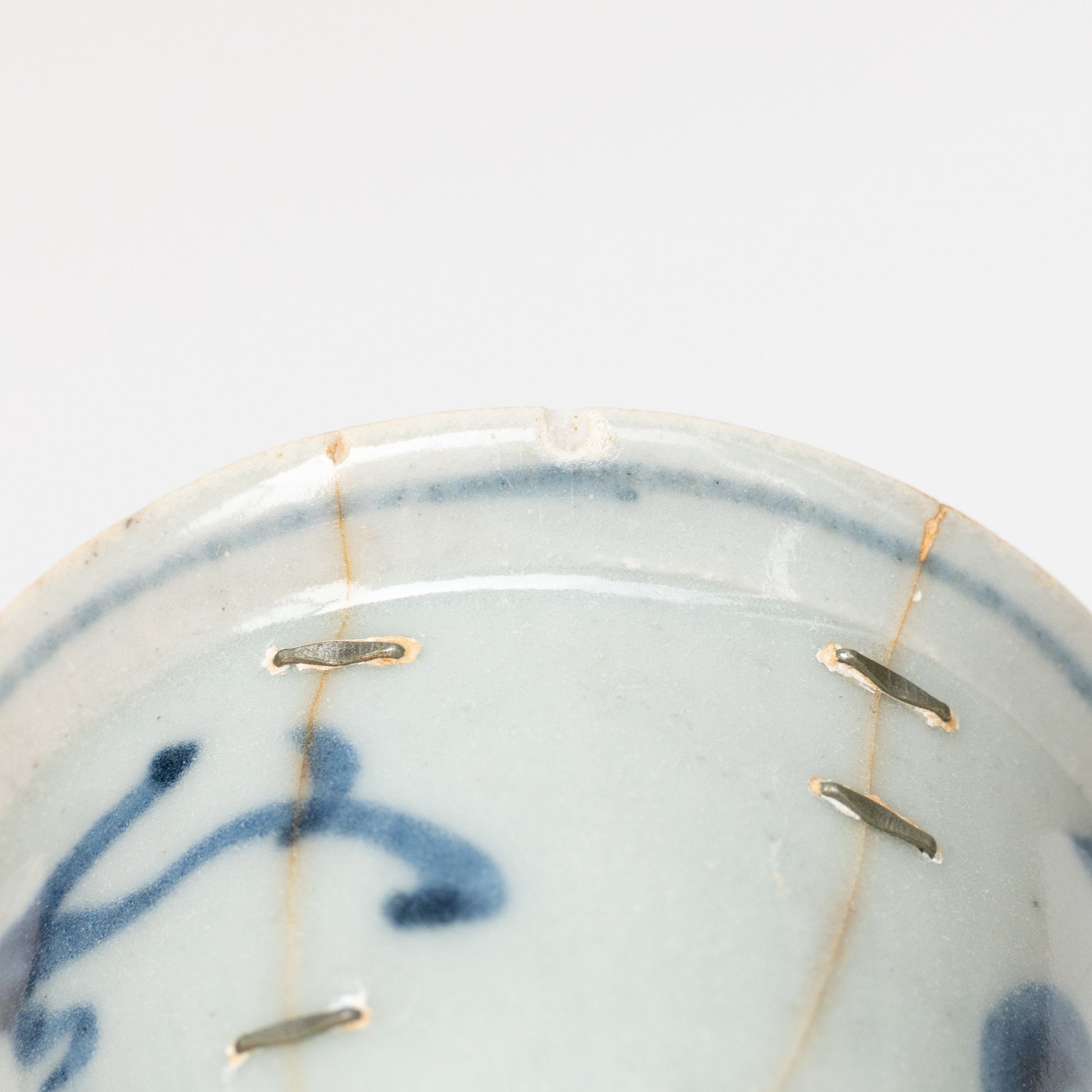 This is a nice cup, simple and elegant. It has three hairline cracks which have been expertly repaired with silver staples.